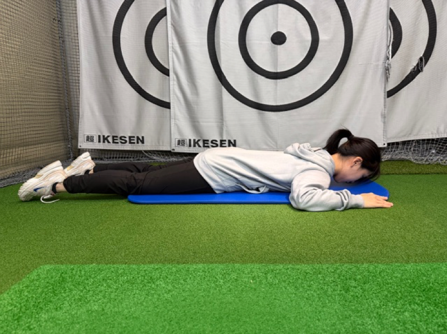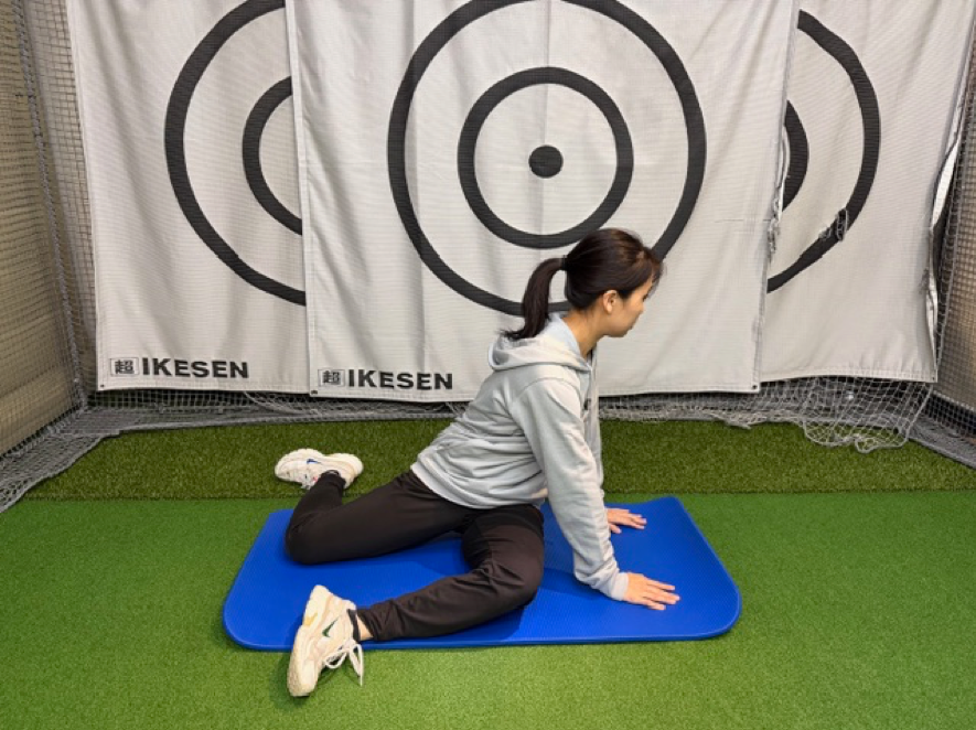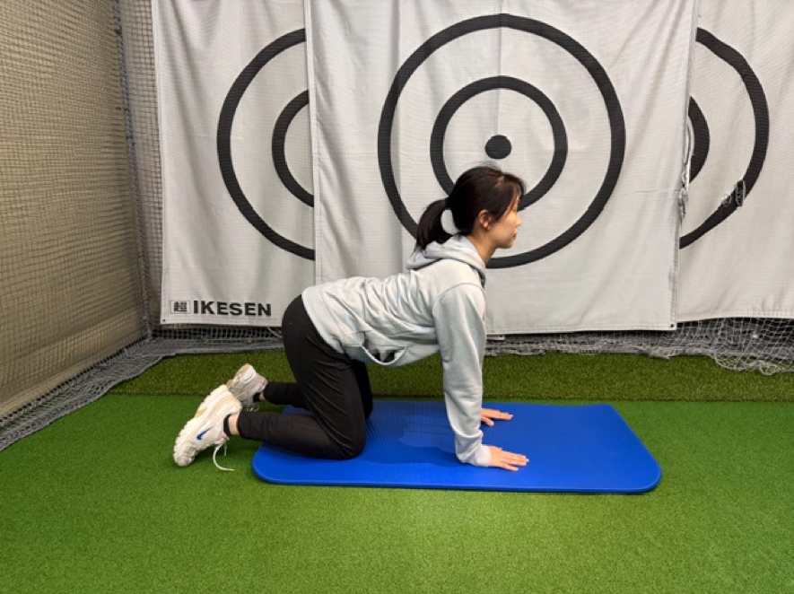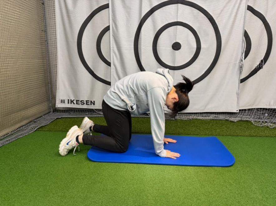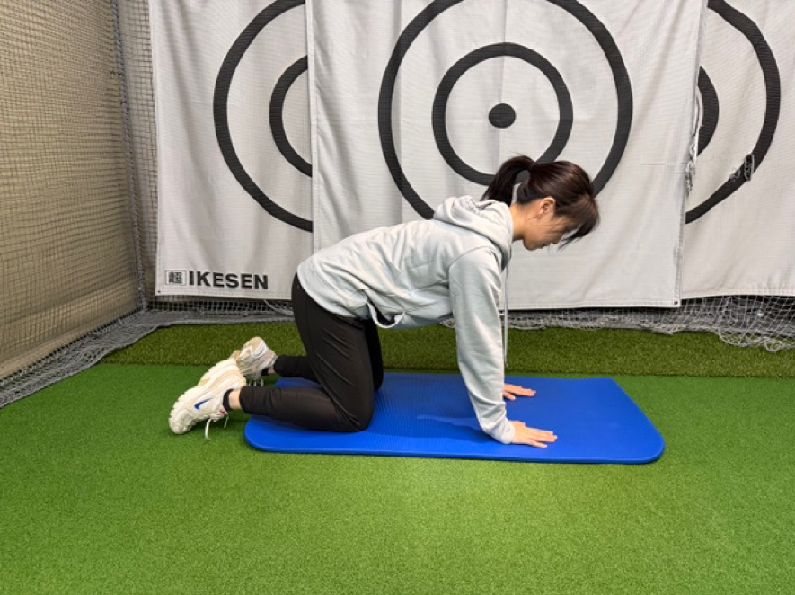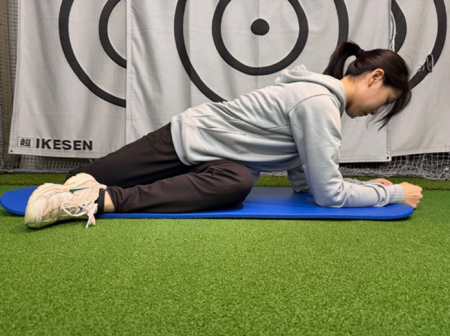 - そのまま肘をついて背中を丸めながら呼吸を繰り返します。背中側が膨らむように呼吸してみてください。