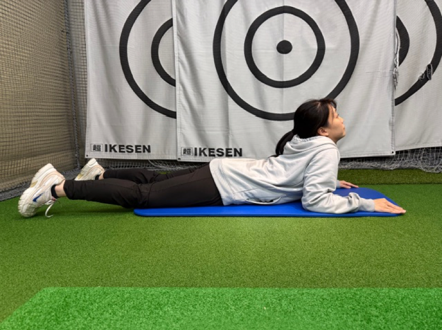 - 胸の下あたりまで起き上がり、そのまま呼吸を続ける。胸の上の方に空気がはいるように呼吸できるといいです。これ以上起き上がると腰が反るため注意してください。