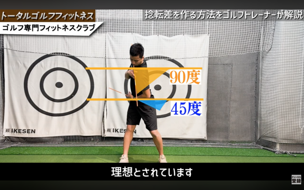 捻転差とは 下半身と上半身の回旋角度の差 のことを指し、理想は下半身約45°、上半身約90°と言われています。