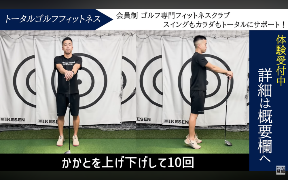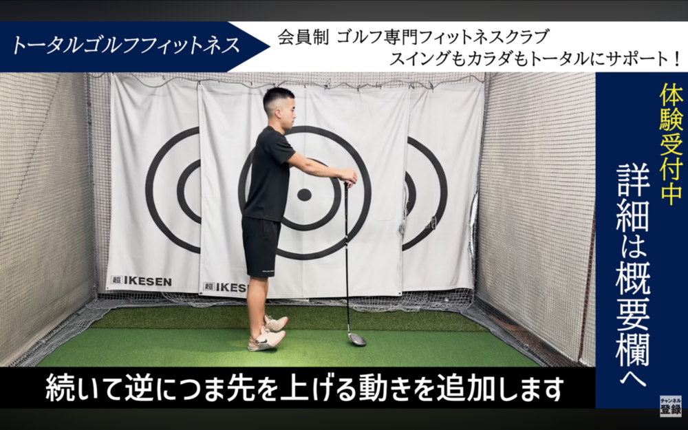 クラブを支えにするとやりやすい。つま先上げは「すねの前側が効いている」感覚を大切に。