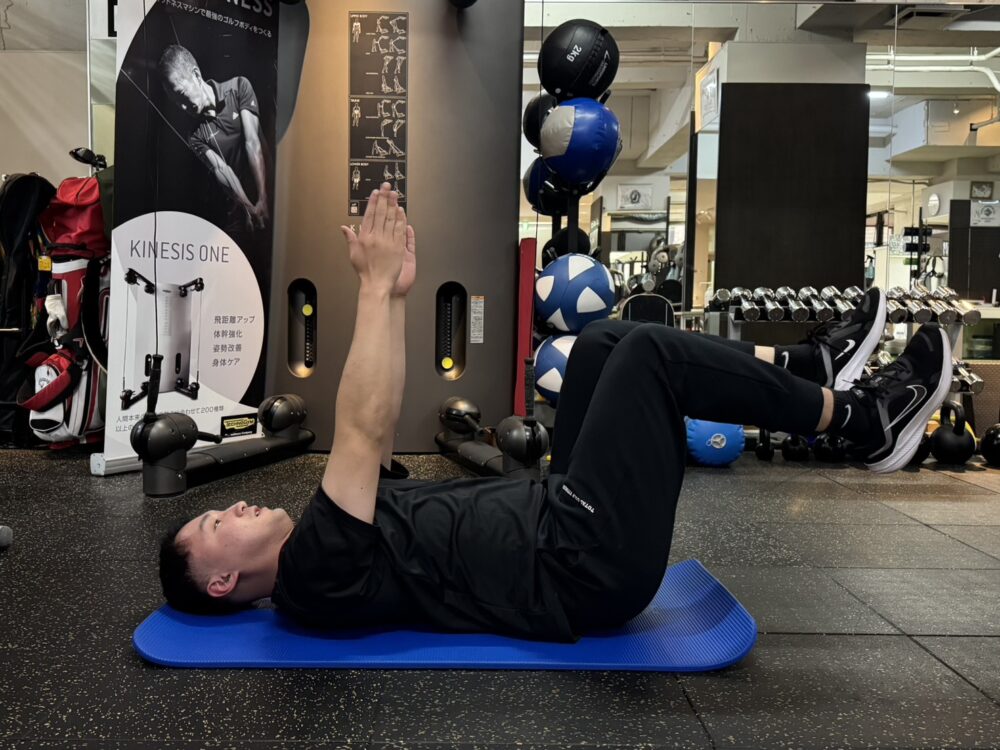 - 仰向けで膝と股関節を90°に曲げ、腕は天井へ伸ばす。