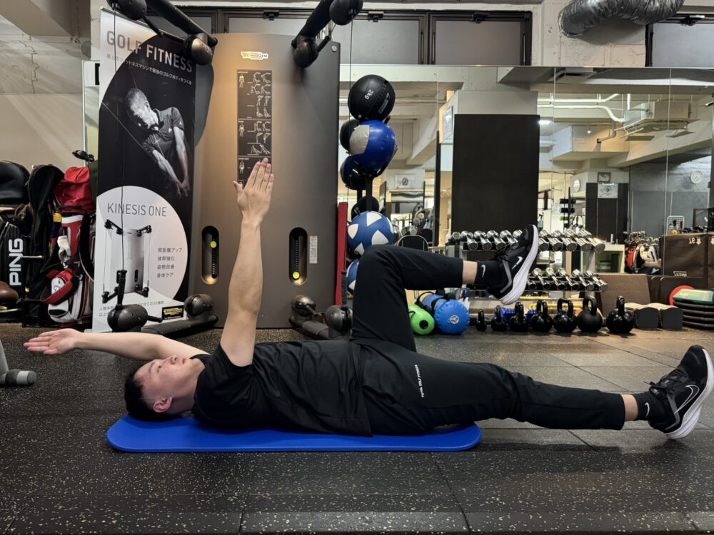 - 腰が浮かない範囲で戻し、反対側も行う。