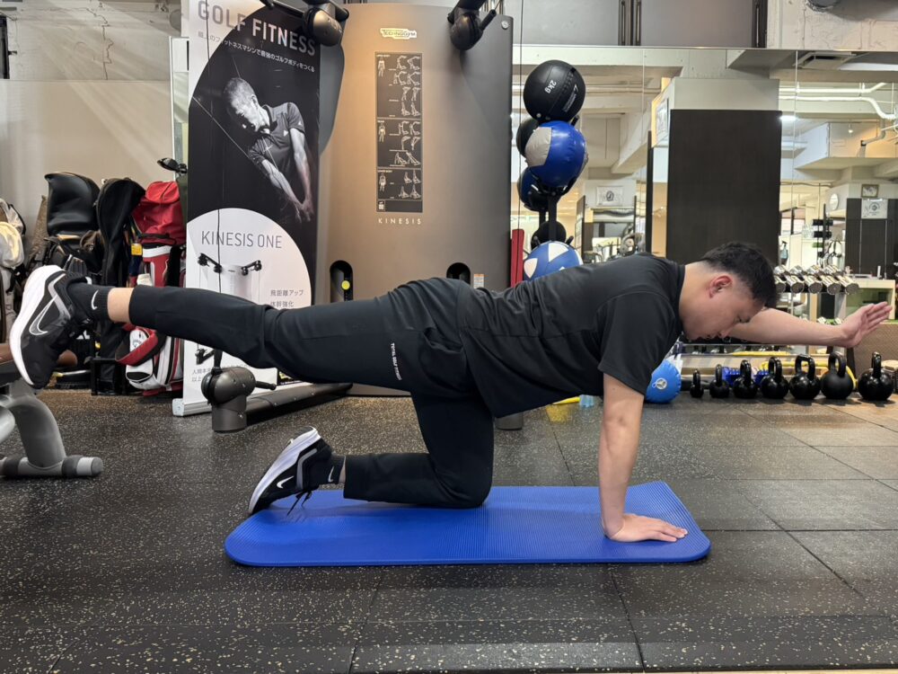 - 対角線上の手と脚を、床に触れないギリギリまでゆっくり伸ばす。