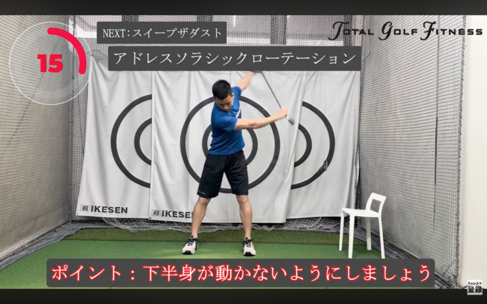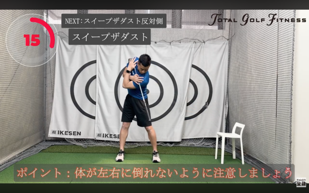 2. 体の軸を保ったまま上半身を回旋し、クラブヘッドが床を“掃く”イメージで左右に動かす(反対側も同様)。 - ポイント