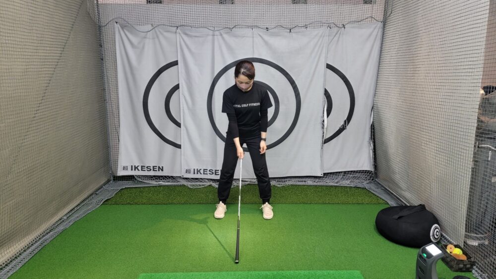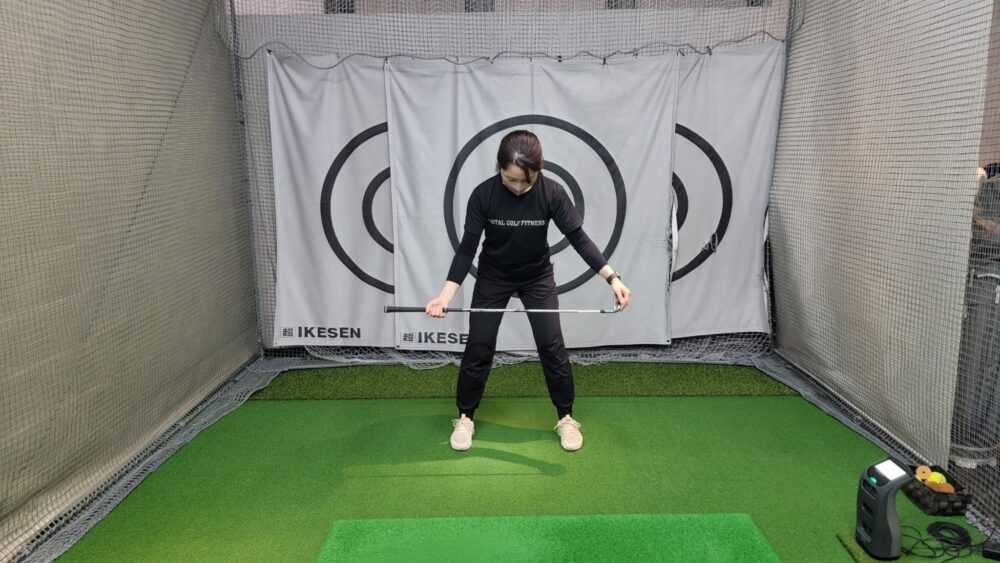 - 右手は逆手、左手はクラブヘッドを持ち、アドレス姿勢になります。