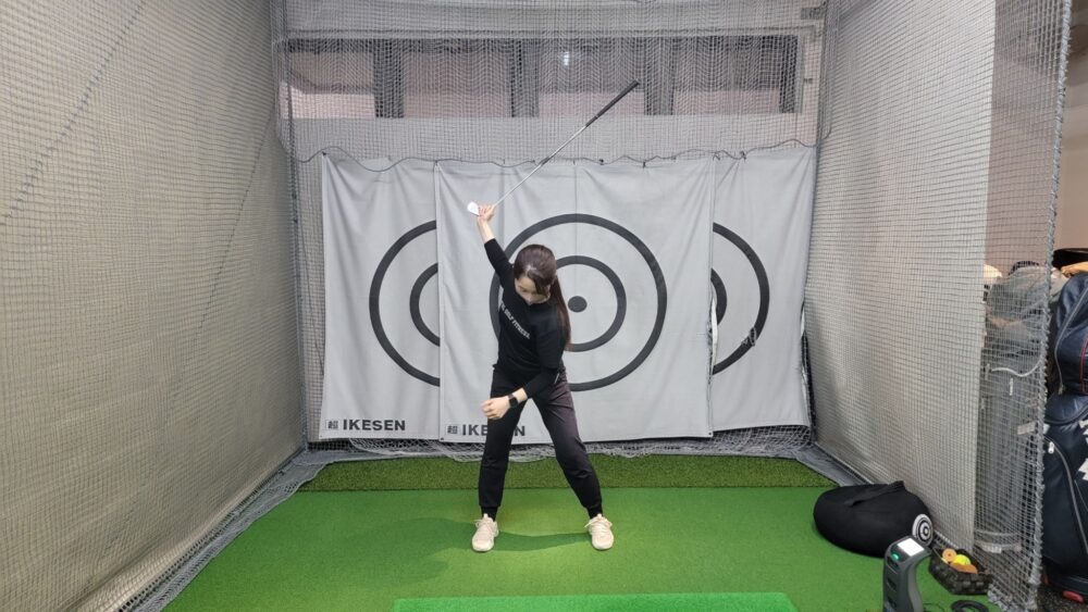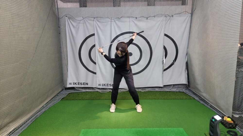 2. 素振り: 何回か右手だけで素振りをし、その流れでトップの位置で静止します(※軸がブレないよう注意!)。
