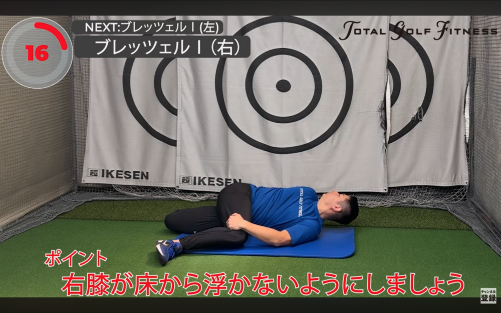 “右膝が床から浮かないように”意識することで、より深いストレッチ感が得られます。