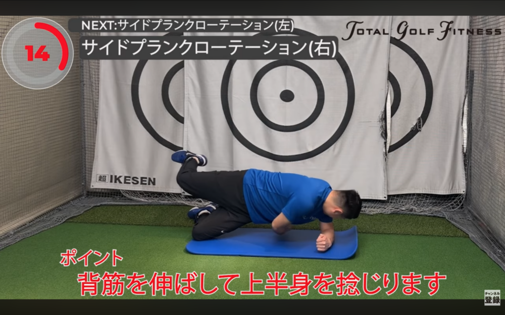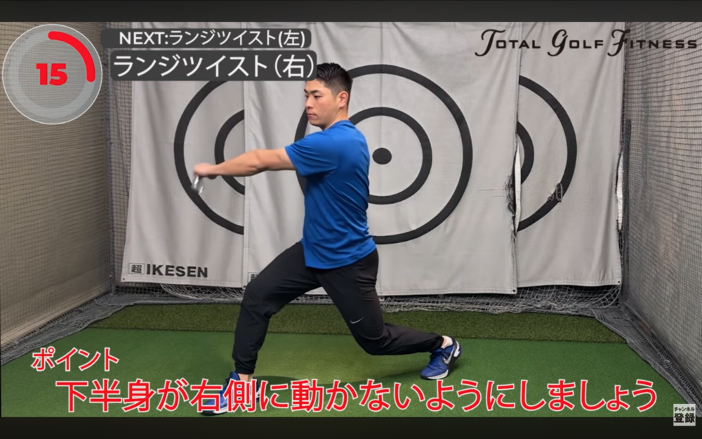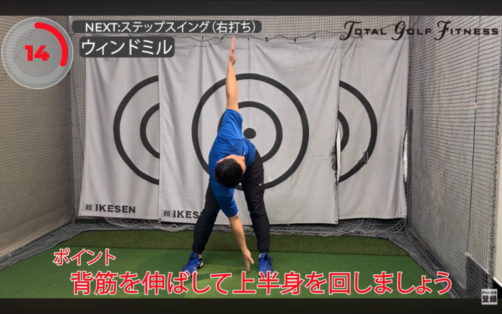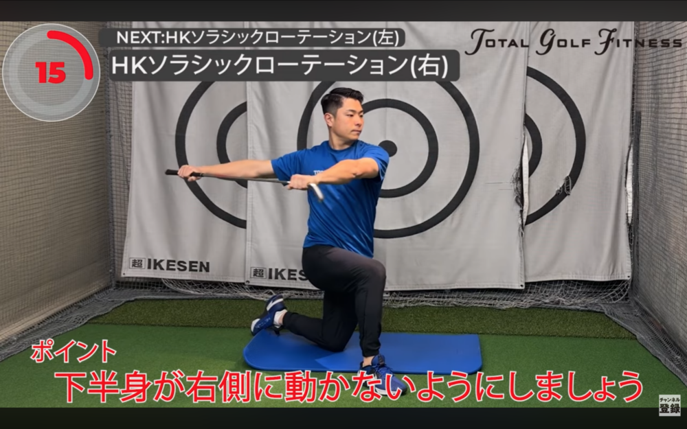 体幹(腹斜筋)の筋力と柔軟性を同時に鍛え、スイングのパワーロスを防ぎます。