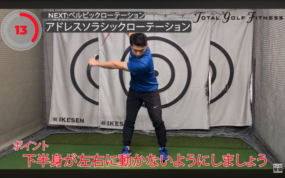 アドレスの姿勢で背中を回すことで、実際のスイングに近い形での可動域を広げます。