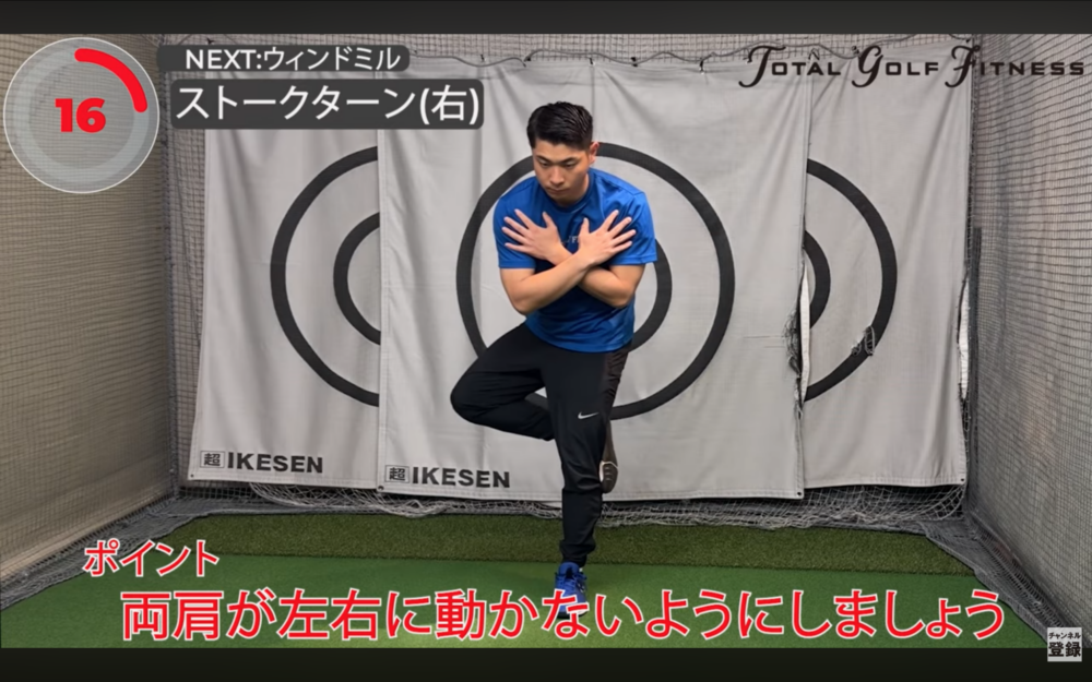 “両肩が左右に動かないように(レベルに回るように)”意識し、軸がぶれないようにします。