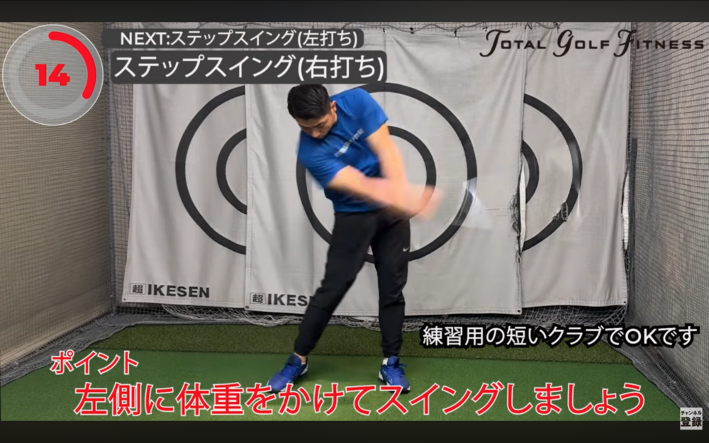 練習用の短いクラブやアイアンを持ち、ステップを踏みながらスイングします。