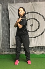 きちんとアドレスの前傾角度に対して水平回旋できるように、以下の写真のようにクラブのグリップ部分がターゲット側になるように両肩にあてて、バックスイングする練習をしてみましょう。下にボールなどの目印を置いて、グリップエンドが目印を指すようにします。位置は実際に打つボールの位置よりも前方になります。鏡を見ながらできるとベストです。バックスイング側だけでなくフォロースルー側でも練習してみてください。このとき必ず身体のどこにストレッチ感や力を感じるかを意識しながら行いましょう。