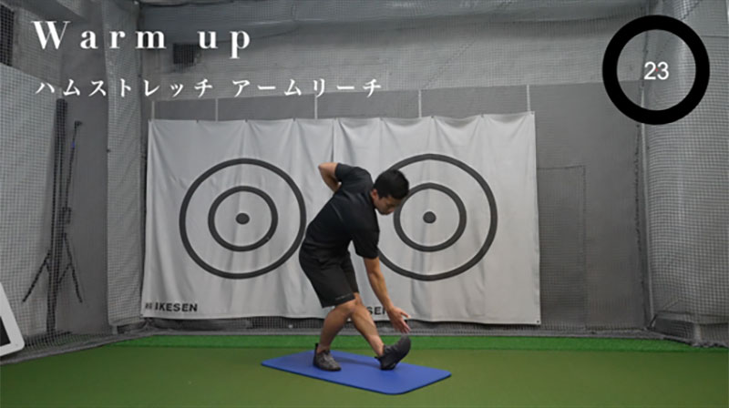 - 片足を前に出したと同時に対側の手をつま先に伸ばすように身体を倒します