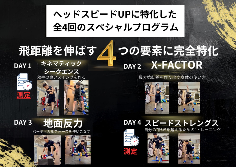 トレーニングがない期間もこのプログラムを実践いただくことで、短期間でのヘッドスピード向上を目指します!